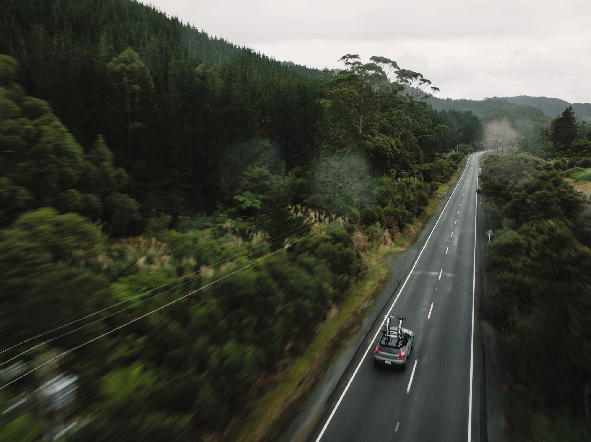 I exerted myself over a few climbs and quickly found my form lacking. A bit of positive self-talk was followed by a few sporadic attacks to really deplete my energy stores. I spotted a glimpse of the rugged coastline. Expansive, rolling and green with a few Nikau palms and larger trees that could barely stand from the relentless howling winds. Dusk came upon us quickly, our weary bodies grimacing as we made our way over the hills that lay between us and the car. By the time I racked the bikes on the car, darkness had crept in and fatigue was at a high. Chips, tunes and lane assist guided us home.